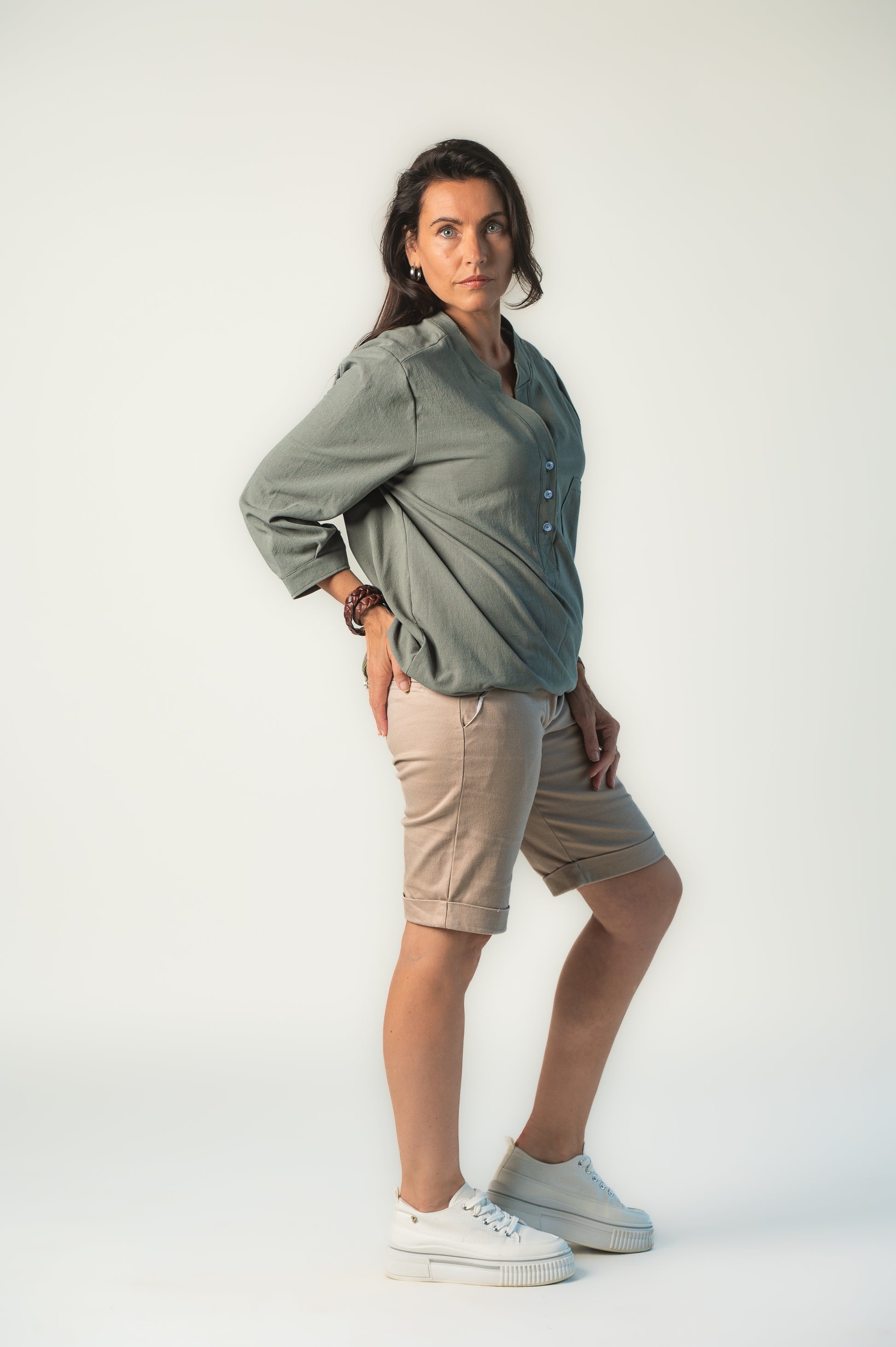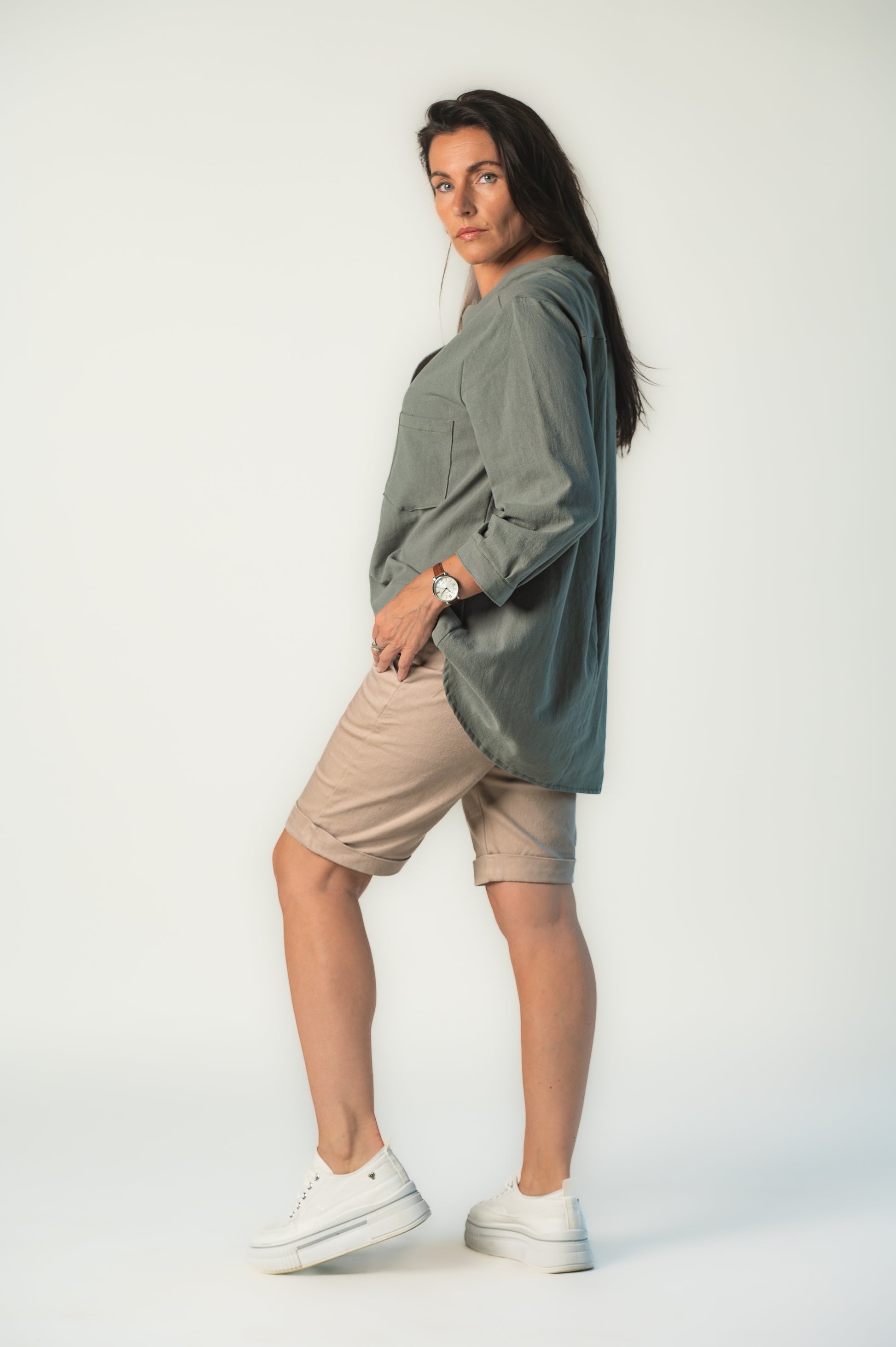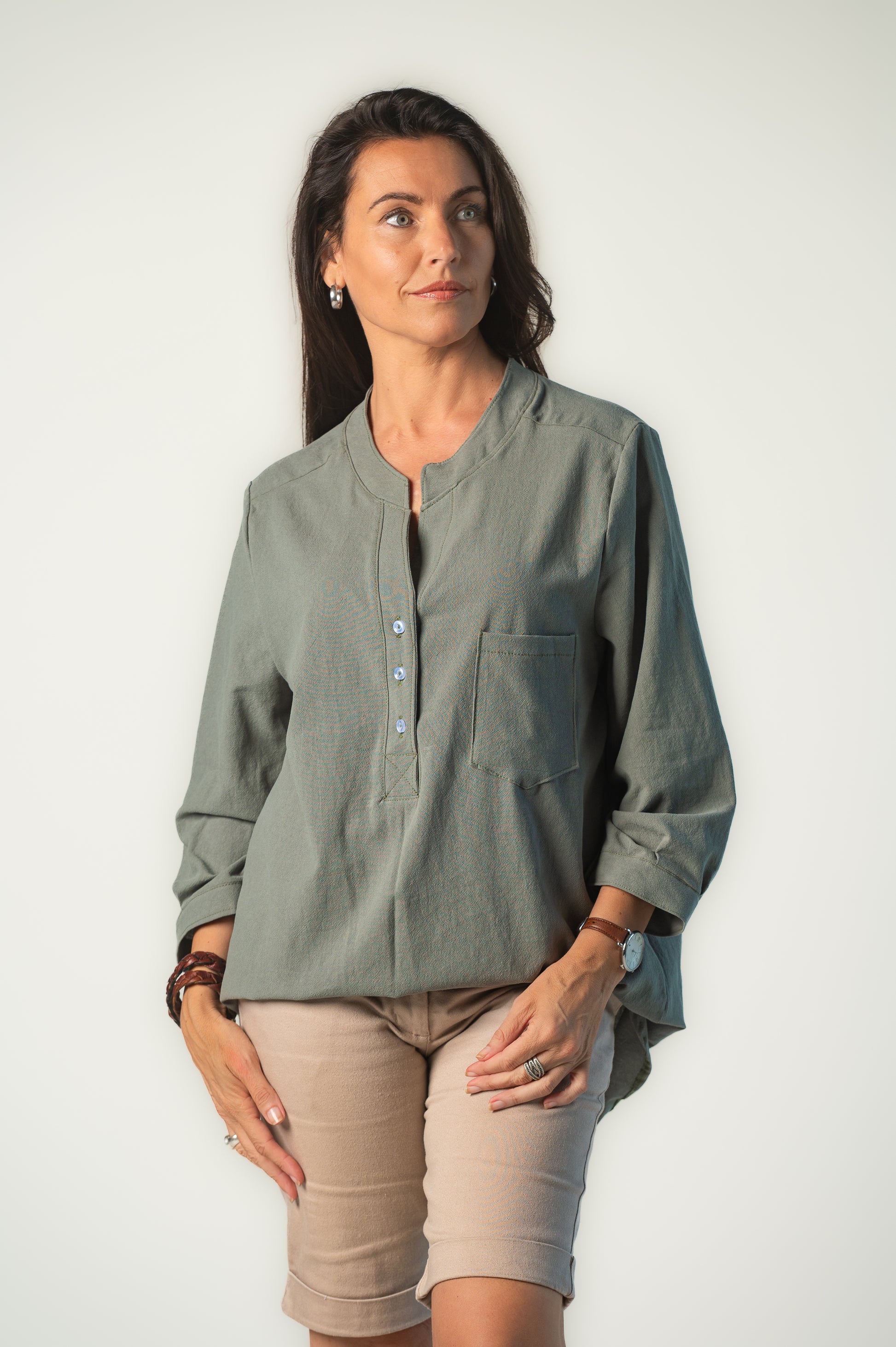 Long sleeve, half button, v front neck line, collar. Manufactured in 100% Cotton.